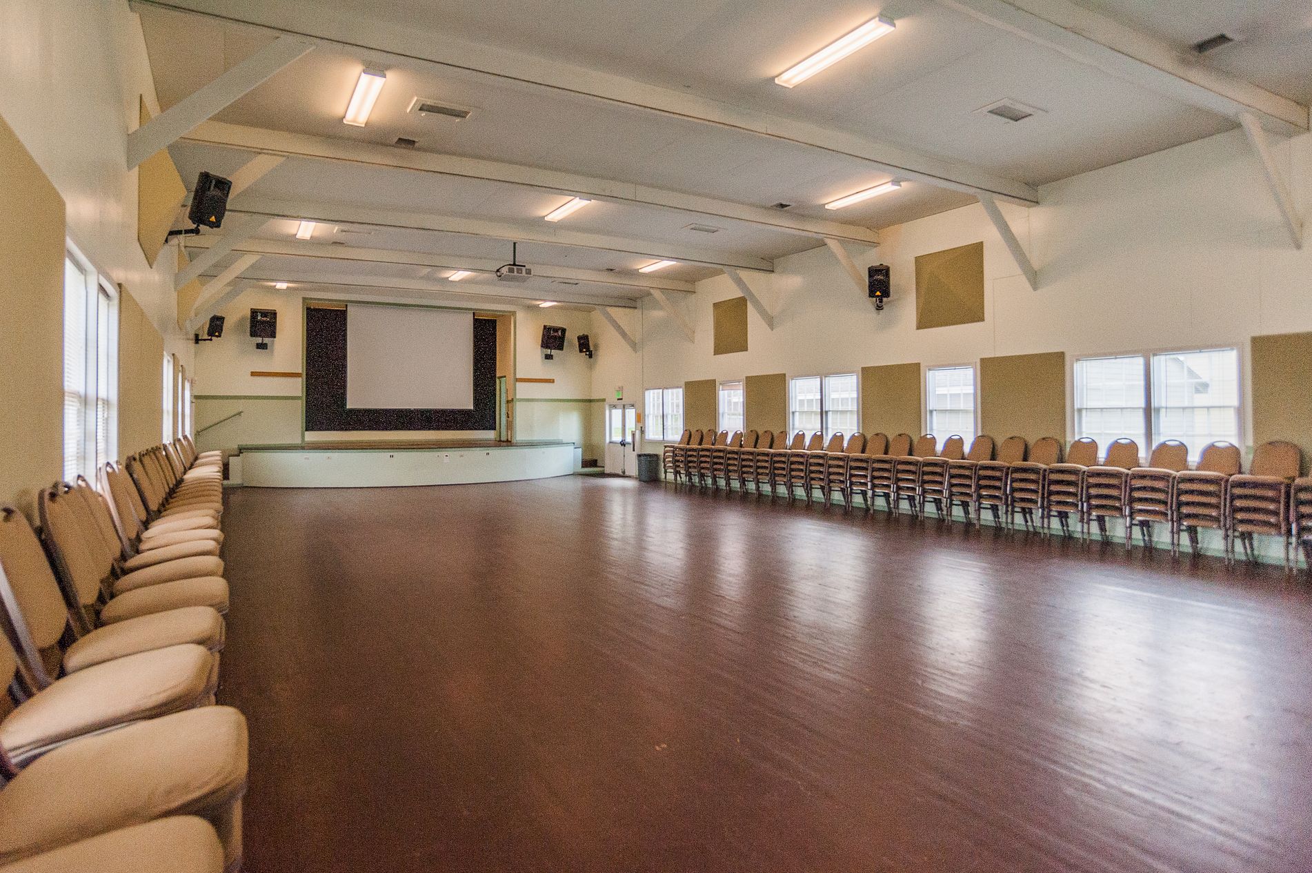 This space is ideal for large-group performances, ceremonies, and presentations. The rounded stage at one end is approximately 4-feet high. There are steps at either side for easy access from the main floor, and three backstage spaces for performers. Stacking chairs for 330 line the side walls.