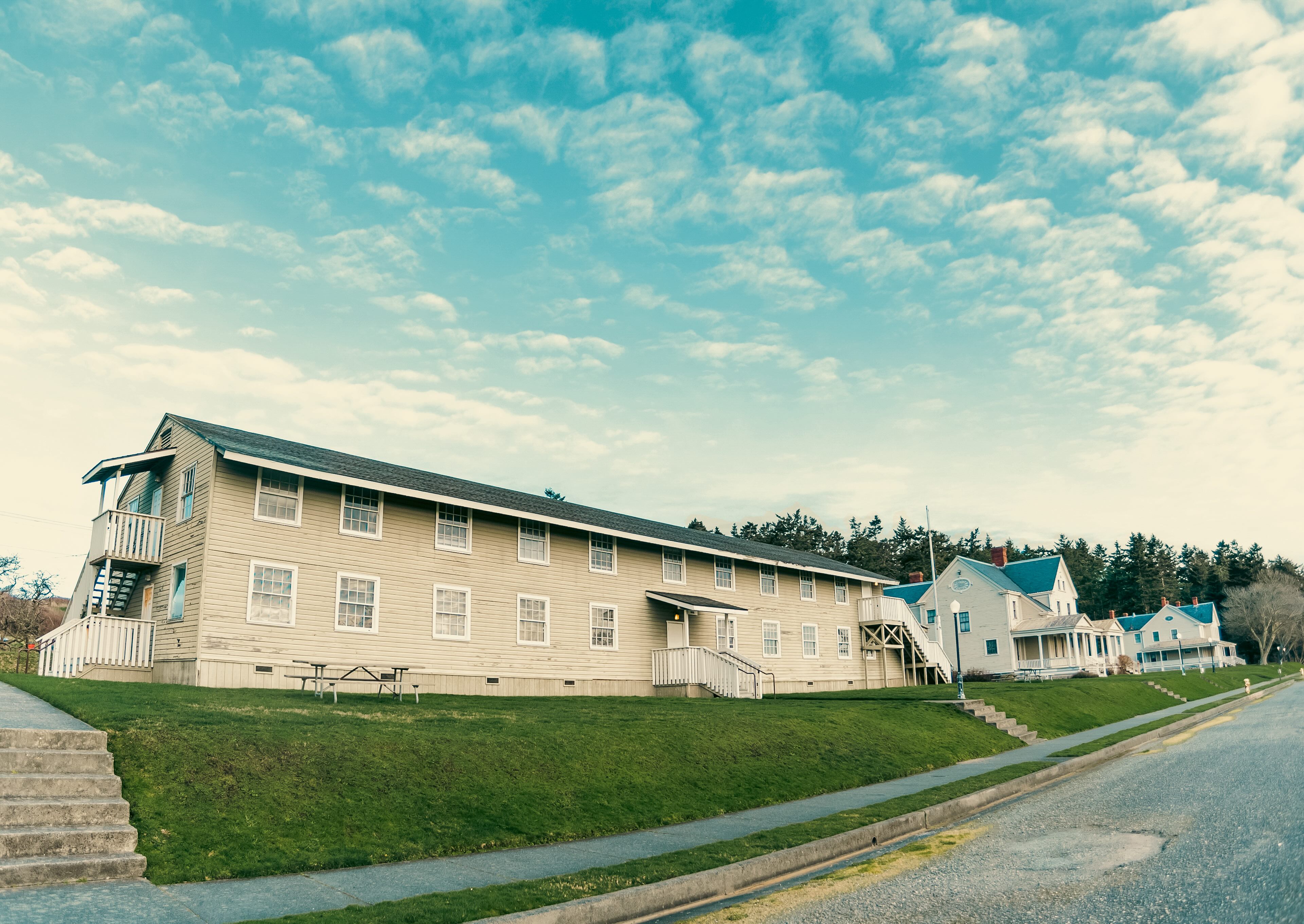 Lodging, dining, and meeting rooms under one roof. The lower level hosts a commercial kitchen, dining room, meeting room, restrooms, four semiprivate bedrooms, and a small meeting area. The larger meeting room is equipped with a podium, a wall-mounted whiteboard, a screen, a ceiling-mounted digital projector, DVD and VCR players, and connector cables for laptop computers.