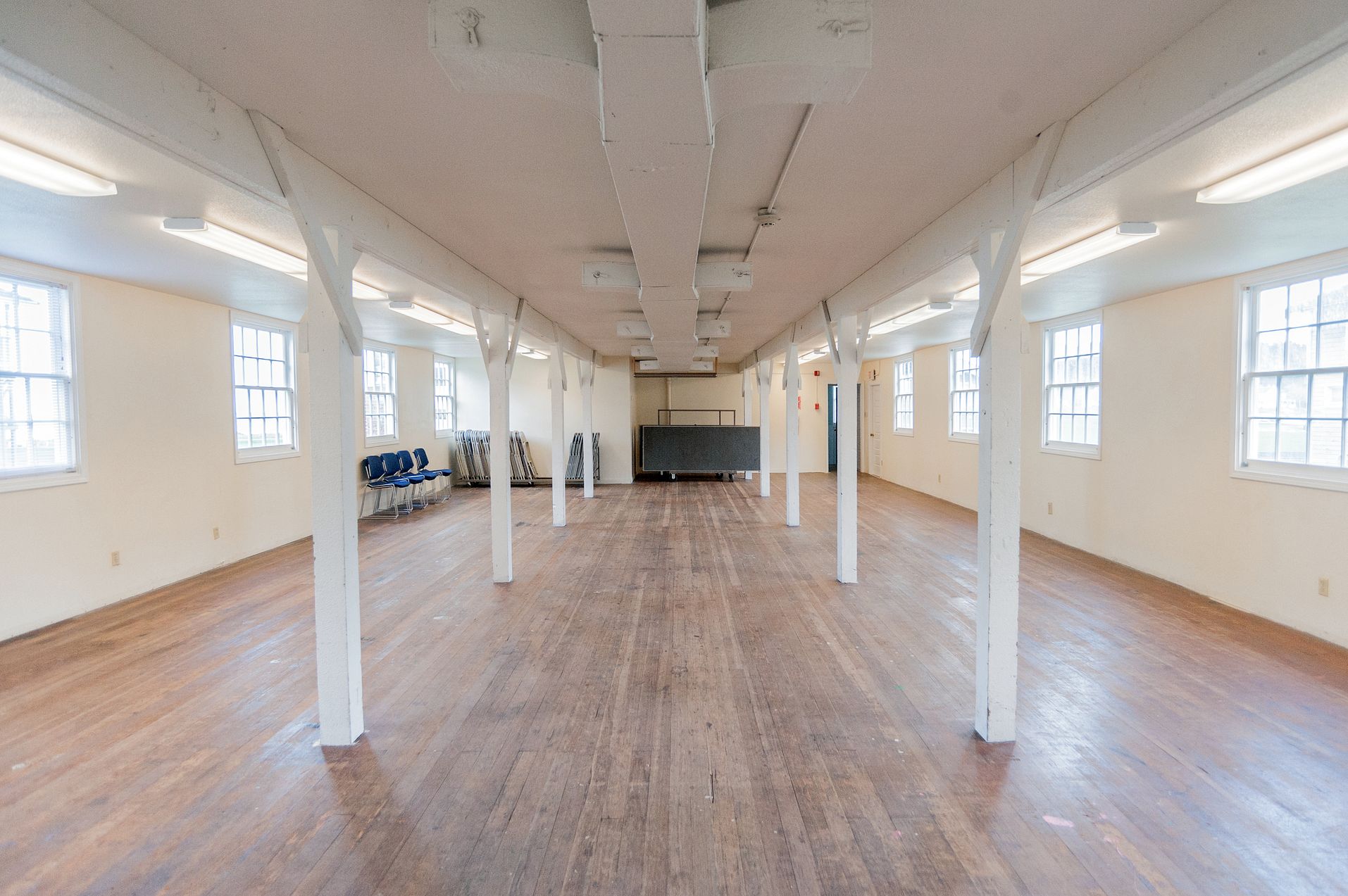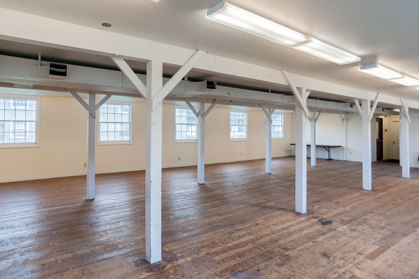 - The upper floor is an open space with columns throughout for support. It is ideal as a classroom or meeting space with capacity seating of 120.