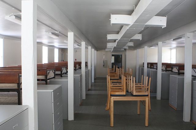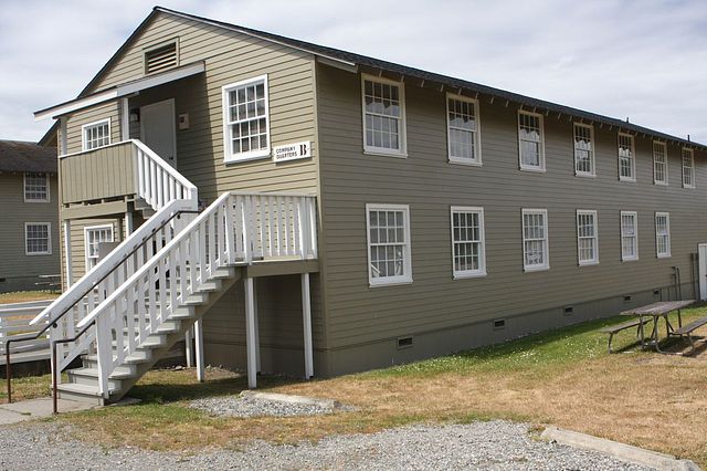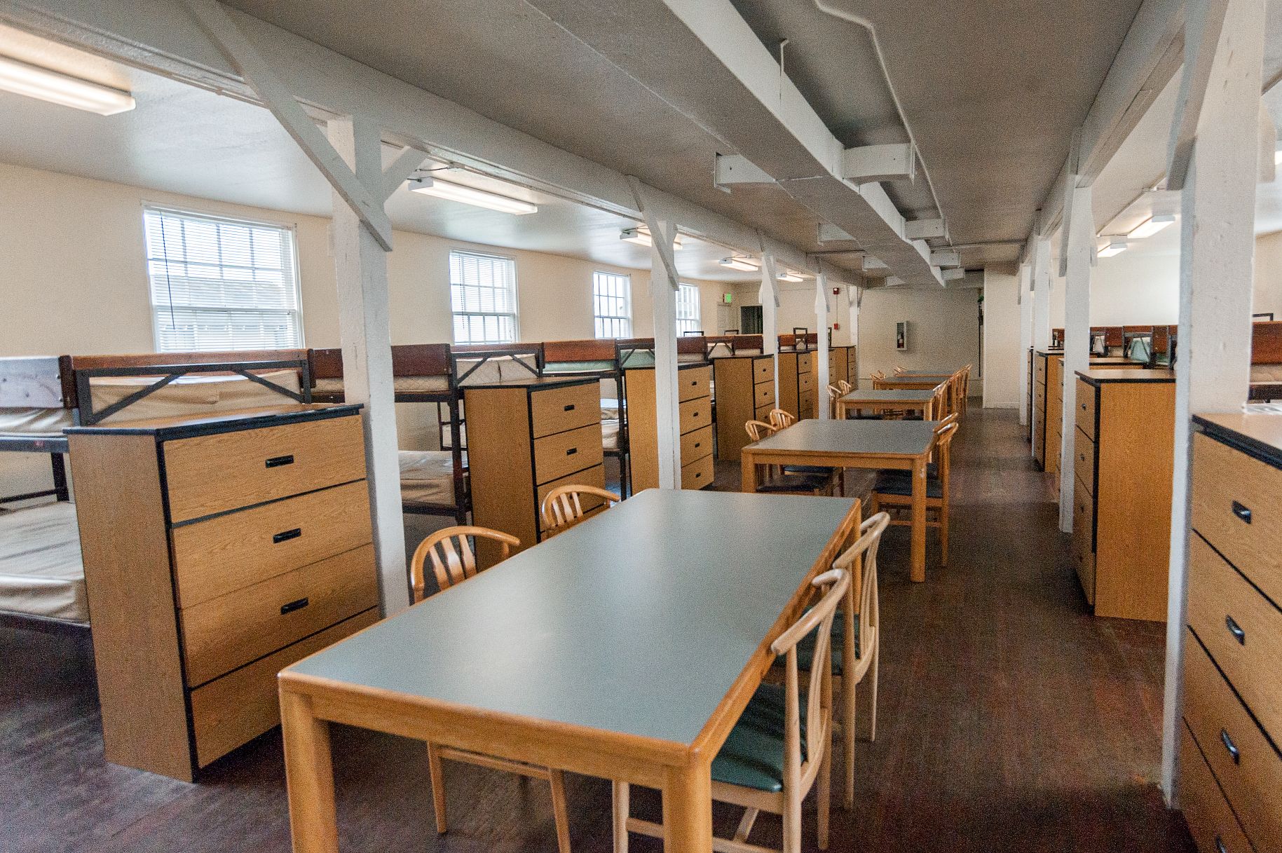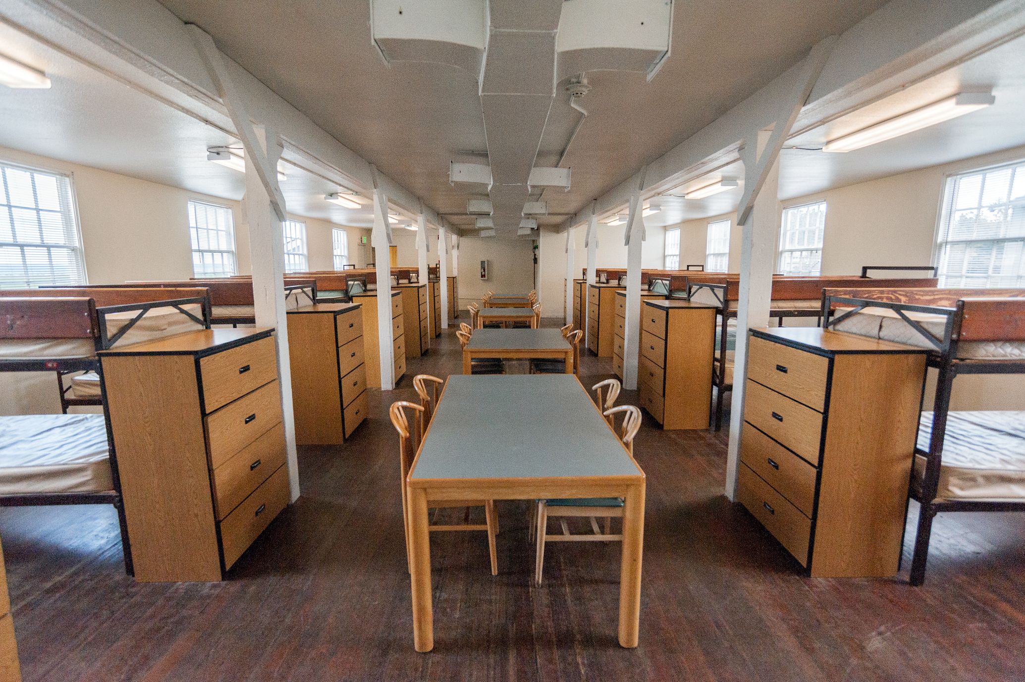 A row of two-story wood frame barracks line the parade field on Casey’s south campus. They maintain a “boot camp” atmosphere. Referred to as company quarters and bunkrooms, these accommodations are available as sleeping facilities and can host groups of 20–335. Group bunkrooms are conducive to team building and single gender groups. Genders can divide per building or floor.